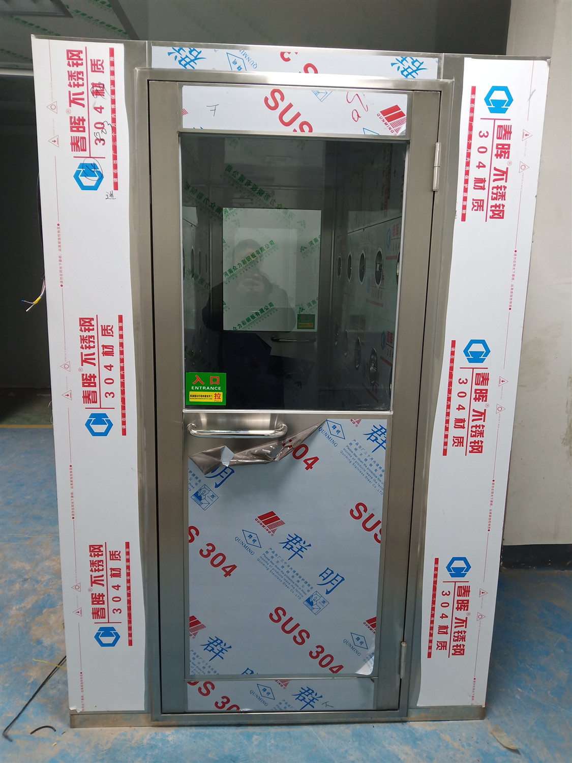 3)不銹鋼板風(fēng)淋室(SUS304),適用于食品加工,醫(yī)藥保健品加工行業(yè),車間環(huán)境比較潮濕但不會(huì)生銹。